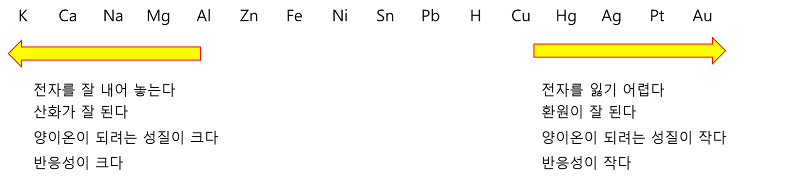 금속은 최외곽의 전자를 잃어 양이온이 되려는 성질이 있습니다. 이러한 성질은 이온화라 하며 수소를 기준으로 하여 이온화하기 쉬운순서를 나열한 것을 이온화 경향이라 합니다.