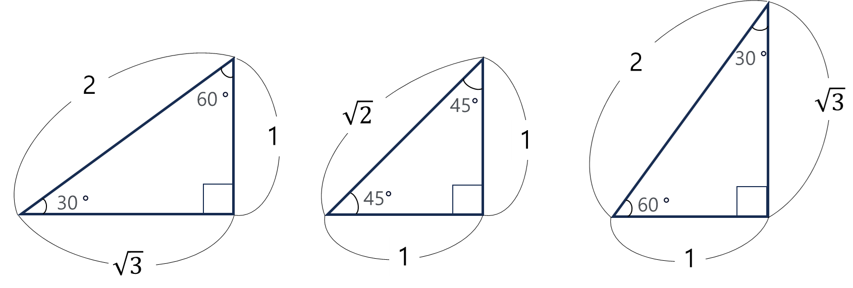 아래 3가지 삼각형을 그리고 피타고라스의 법칙을 이용해 가장 짧은 변을 1이라 놓으면 아래와 같이 나머지 두 변의 길이를 알수 있습니다. 이때 위 표에 대한 값을 넣으면 쉽게 정리 할 수 있습니다.